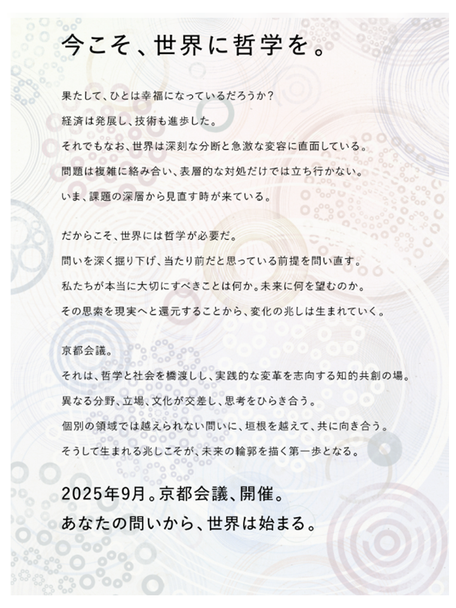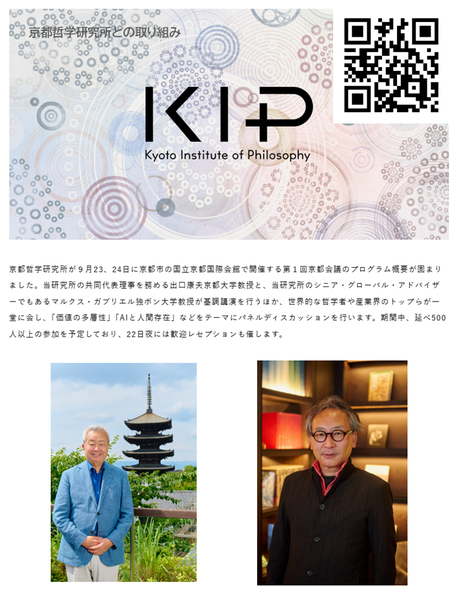 一般社団法人京都哲学研究所(共同代表理事:出口康夫・澤田純)は、2025年9月に第1回京都会議を開催します。本会議では、人工知能(AI)時代にこそ必要となる、社会の根幹たる「価値観」や「価値」についての議論と対話を、世界的な哲学者・科学者・経営者・技術者・芸術家・宗教家らとともに織り成します。また、本会議の内容を国際社会に発信し新たな議論と対話を喚起していくことで、「価値多層社会」実現に向けた国際的運動体の端緒としていきます。私共財団はドキュメンタリー制作からプレス情報制作、様々な制作を動画・フォト・音声を通して展開しております。企業広報のアドバイザーとしてもお役に立てる体制を取っており、またプロの制作者育成プログラムも年間で行っており、今年度も外国人を含めた育成参加者に様々な実践的チャンスを作っております。